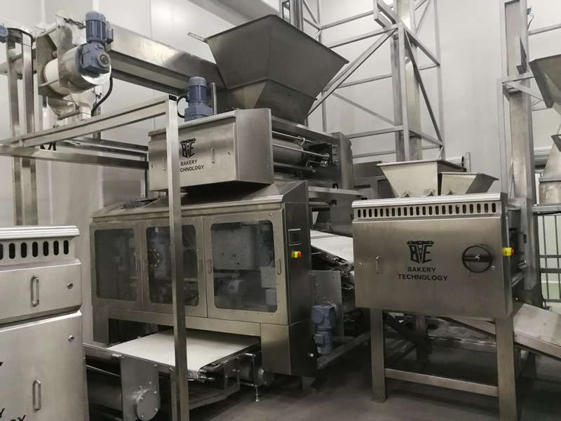 配合喂料機(jī)將軋薄的面皮切片并依次疊加至8~16層,并輸送至成型軋輥,該機(jī)能將回面始終處于面皮底部,經(jīng)切片式疊層機(jī)生產(chǎn)出來(lái)的餅干層次感強(qiáng)、口感松脆、酥化程度極高,配合機(jī)器上的撒酥機(jī),可生產(chǎn)蘇打餅干和其它高檔餅干。