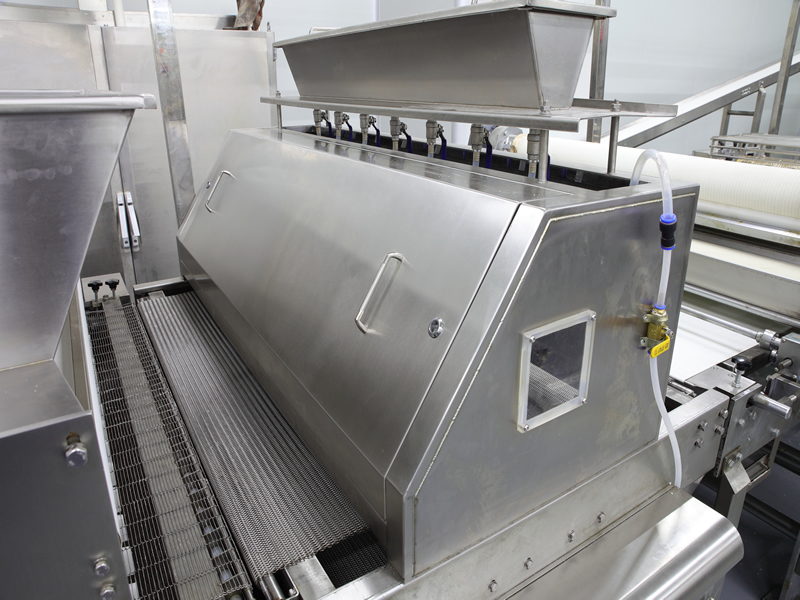 該設(shè)備應(yīng)用于將固體顆粒或者粉狀調(diào)味料,鹽,糖,芝麻及果仁片等撒布在面皮或則餅干上?;厥諜C(jī)回收多余的撒布物料循環(huán)利用。